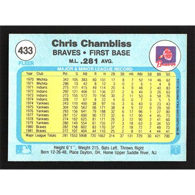 This is a 1982 Fleer Chris Chambliss baseball card. The card is #433 and pictures show condition.