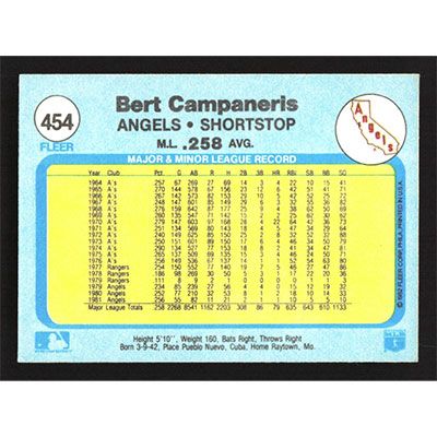 This is a 1982 Fleer Bert Campaneris baseball card. The card is #454 and pictures show condition.