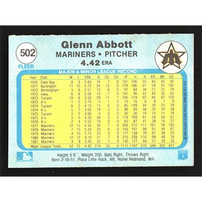 This is a 1982 Fleer Glenn Abbott baseball card. The card is #502 and pictures show condition.