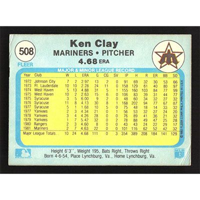 This is a 1982 Fleer Ken Clay baseball card. The card is #508 and pictures show condition.