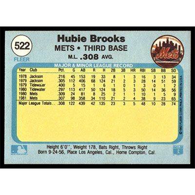 This is a 1982 Fleer Hubie Brooks baseball card. The card is #522 and pictures show condition.