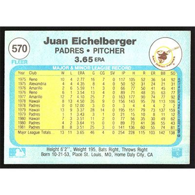 This is a 1982 Fleer Juan Eichelberger baseball card. The card is #570 and pictures show condition.