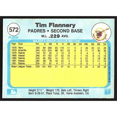 This is a 1982 Fleer Tim Flannery baseball card. The card is #572 and pictures show condition.