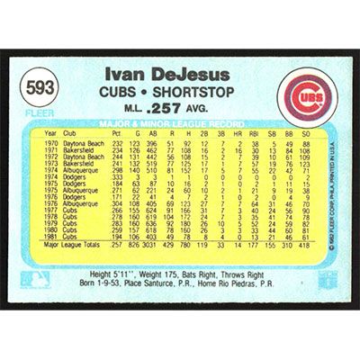 This is a 1982 Fleer Ivan DeJesus baseball card. The card is #593 and pictures show condition.