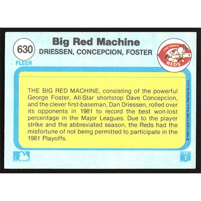 This is a 1982 Fleer Dan Driessen, Dave Concepcion and George Foster Big Red Machine baseball card. The card is #630 and pictures show condition. Team(s): Cincinnati Reds