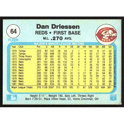 This is a 1982 Fleer Dan Driessen baseball card. The card is #64 and pictures show condition.