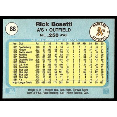 This is a 1982 Fleer Rick Bosetti baseball card. The card is #88 and pictures show condition.