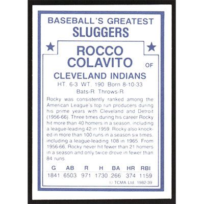 This is a 1982 TCMA Baseball's Greatest Sluggers Rocky Colavito baseball card. The card is #39 and pictures show condition.