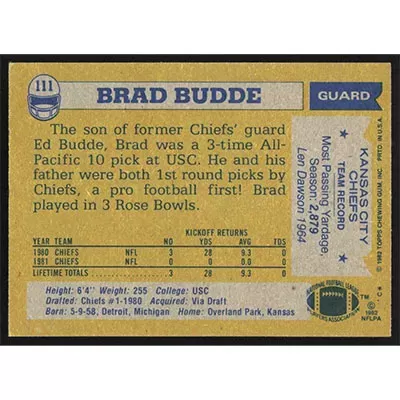 This is a 1982 Topps Brad Budde football card. The card is #111 and pictures show condition.