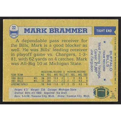 This is a 1982 Topps Mark Brammer football card. The card is #22 and pictures show condition.