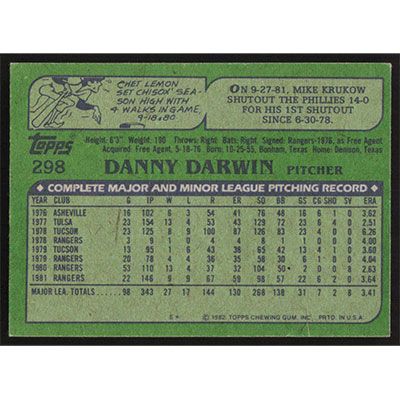 This is a 1982 Topps Danny Darwin baseball card. The card is #298 and pictures show condition.
