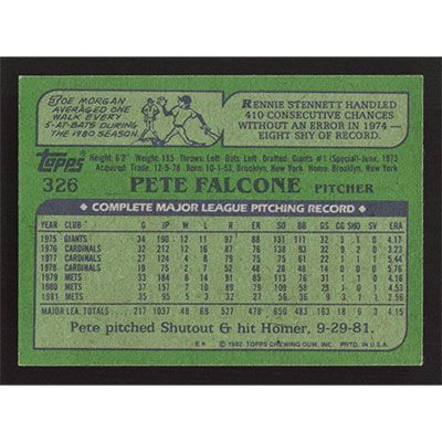 This is a 1982 Topps Pete Falcone baseball card. The card is #326 and pictures show condition.
