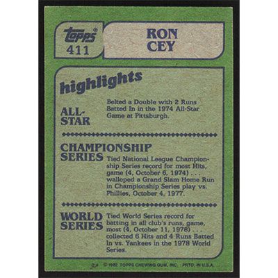 This is a 1982 Topps Ron Cey In Action baseball card. The card is #411 and pictures show condition.