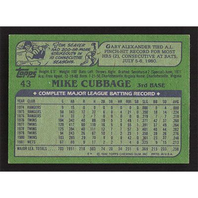 This is a 1982 Topps Mike Cubbage baseball card. The card is #43 and pictures show condition.