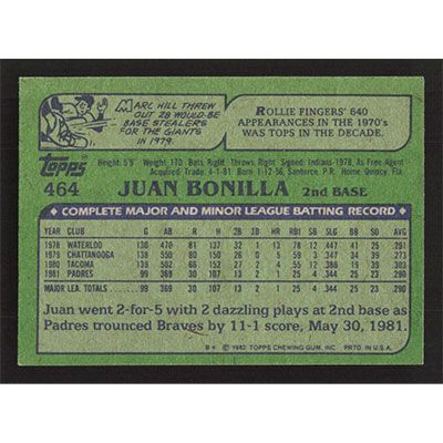 This is a 1982 Topps Juan Bonilla baseball card. The card is #464 and pictures show condition.