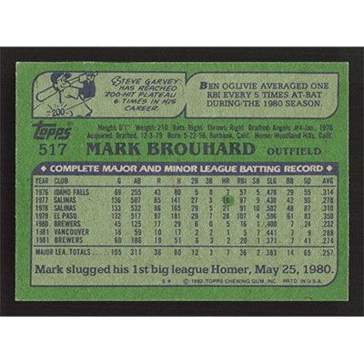 This is a 1982 Topps Mark Brouhard baseball card. The card is #517 and pictures show condition.
