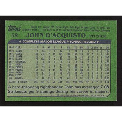 This is a 1982 Topps John D'Acquisto baseball card. The card is #58 and pictures show condition.