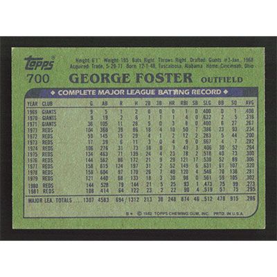 This is a 1982 Topps George Foster baseball card. The card is #700 and pictures show condition.