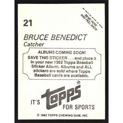 This is a 1982 Topps Stickers Bruce Benedict baseball card. The card is #21 and pictures show condition.