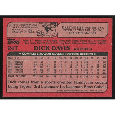 This is a 1982 Topps Traded Dick Davis baseball card. The card is #24T and pictures show condition.