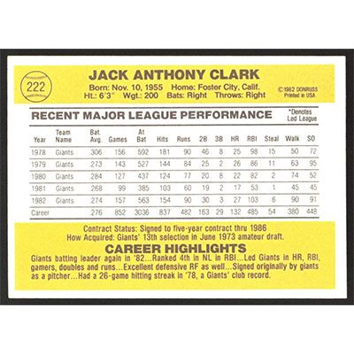 This is a 1983 Donruss Jack Clark baseball card. The card is #222 and pictures show condition.