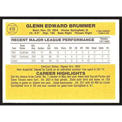 This is a 1983 Donruss Glenn Brummer baseball card. The card is #418 and pictures show condition.