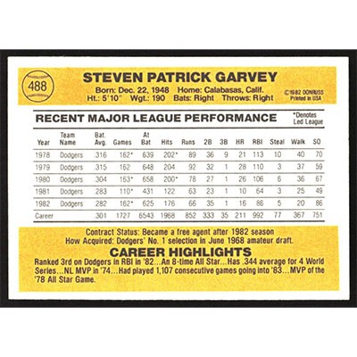 This is a 1983 Donruss Steve Garvey baseball card. The card is #488 and pictures show condition.