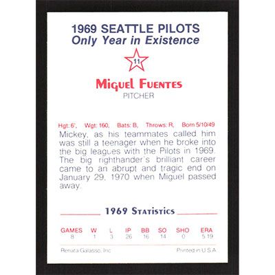 This is a 1983 Galasso '69 Pilots Miguel Fuentes baseball card. The card is #11 and pictures show condition.