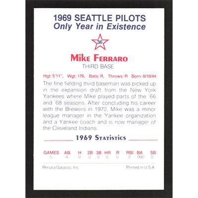 This is a 1983 Galasso '69 Pilots Mike Ferraro baseball card. The card is #36 and pictures show condition.