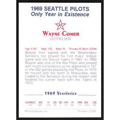 This is a 1983 Galasso '69 Pilots Wayne Comer baseball card. The card is #42 and pictures show condition.