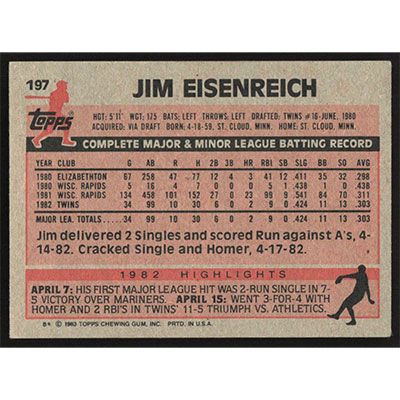 This is a 1983 Topps Jim Eisenreich baseball card. The card is #197 and pictures show condition.