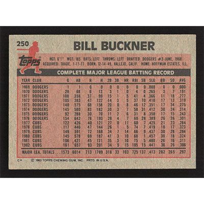 This is a 1983 Topps Bill Buckner baseball card. The card is #250 and pictures show condition.
