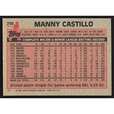 This is a 1983 Topps Manny Castillo baseball card. The card is #258 and pictures show condition.