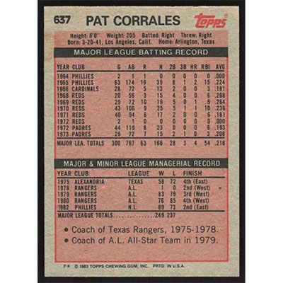 This is a 1983 Topps Pat Corrales baseball card. The card is #637 and pictures show condition.