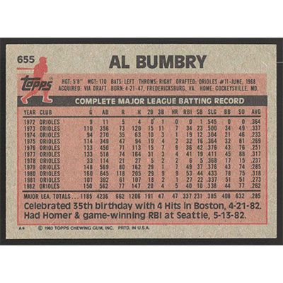 This is a 1983 Topps Al Bumbry baseball card. The card is #655 and pictures show condition.