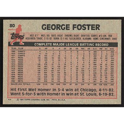 This is a 1983 Topps George Foster baseball card. The card is #80 and pictures show condition.