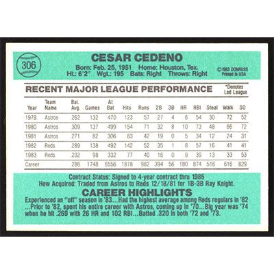 This is a 1984 Donruss Cesar Cedeno baseball card. The card is #306 and pictures show condition.