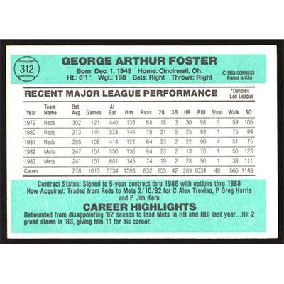 This is a 1984 Donruss George Foster baseball card. The card is #312 and pictures show condition.