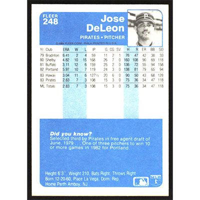 This is a 1984 Fleer Jose DeLeon baseball card. The card is #248 and pictures show condition.