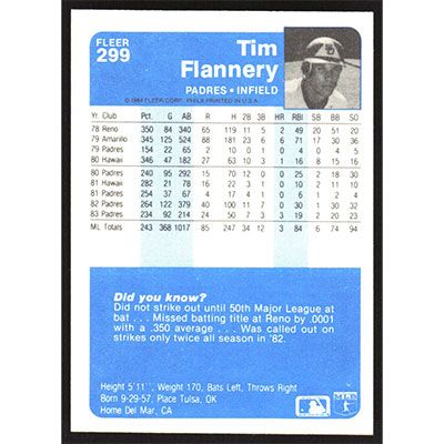 This is a 1984 Fleer Tim Flannery baseball card. The card is #299 and pictures show condition.