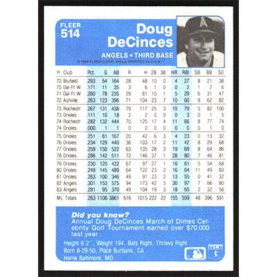 This is a 1984 Fleer Doug DeCinces baseball card. The card is #514 and pictures show condition.