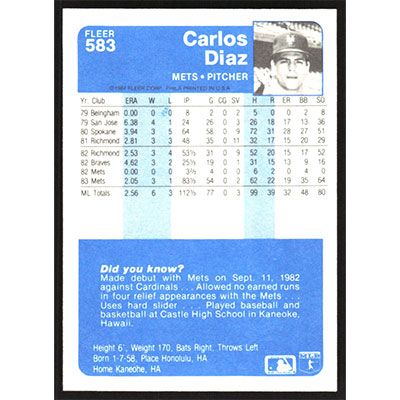 This is a 1984 Fleer Carlos Diaz baseball card. The card is #583 and pictures show condition.