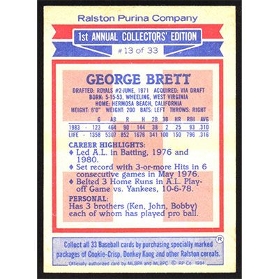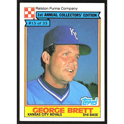 This is a 1984 Ralston Purina George Brett baseball card. The card is #13 and pictures show condition.