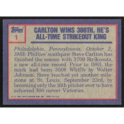 This is a 1984 Topps Steve Carlton Highlight baseball card. The card is #1 and pictures show condition.