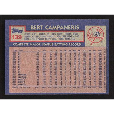 This is a 1984 Topps Bert Campaneris baseball card. The card is #139 and pictures show condition.