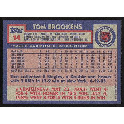 This is a 1984 Topps Tom Brookens baseball card. The card is #14 and pictures show condition.