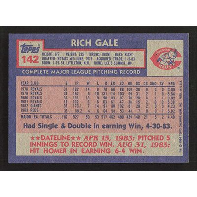 This is a 1984 Topps Rich Gale baseball card. The card is #142 and pictures show condition.