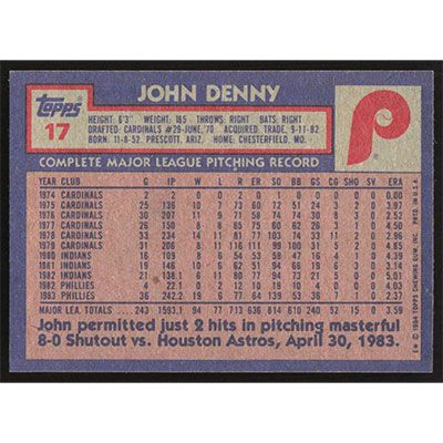 This is a 1984 Topps John Denny baseball card. The card is #17 and pictures show condition.