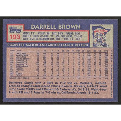 This is a 1984 Topps Darrell Brown baseball card. The card is #193 and pictures show condition.