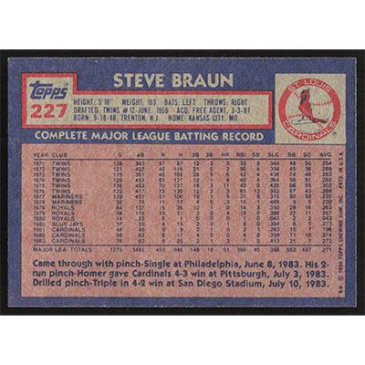 This is a 1984 Topps Steve Braun baseball card. The card is #227 and pictures show condition.